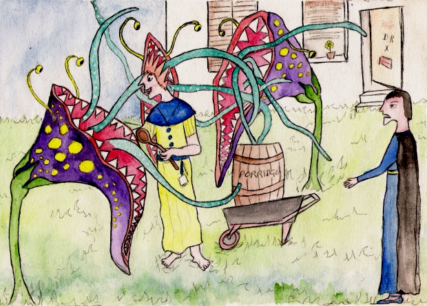 Without further delay Dracula went to visit X, the mad scientist. He would know how to build a ship. X was in his garden feeding his man eating plants on porridge. (It was very difficult to find volunteers to feed the plants. On the whole people had better things to do than be lunch for a monstrous weed.) Dracula stood well back while the plants eyed him hungrily and munched on the porridge. "We need a ship," said Dracula, coming straight to the point. |