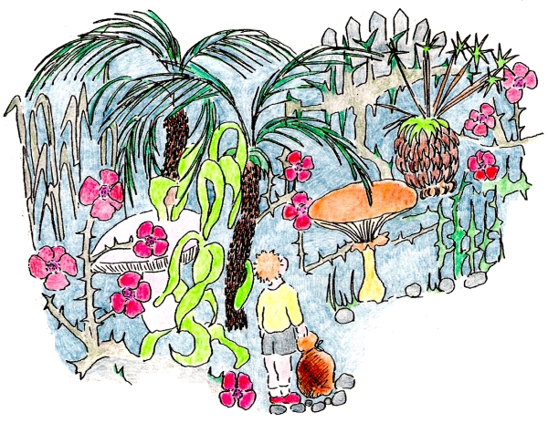 ![]() The valley Thomas came to was hot and tall, junglish plants grew there. Thomas saw the back blades of the stegosaur just showing above a spiky tree top. He ran down into the secret jungle, past giant ferns and gigantic mushrooms, along the safe, secret path that he had found before. |